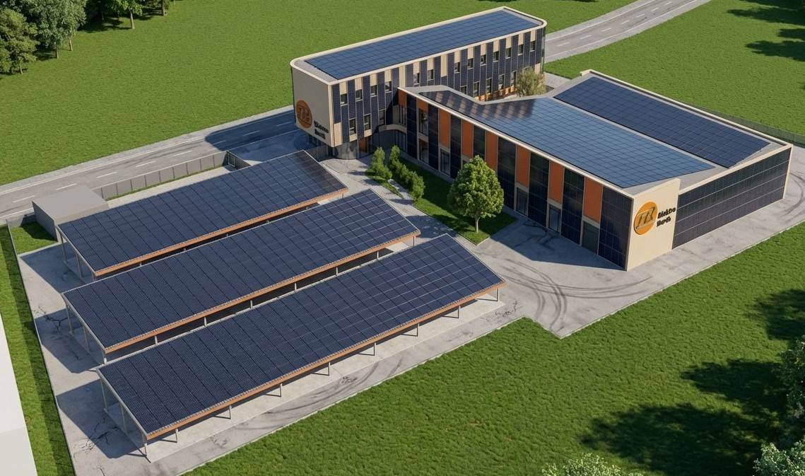 Geneigte Dachflächen und großzügig aufgespannte Fassaden bieten optimale Voraussetzungen für die Integration von Photovoltaikanlagen. In Kombination mit einem Energiespeicher und E-Ladesäulen wird eine weitgehend autarke Energieversorgung angestrebt.